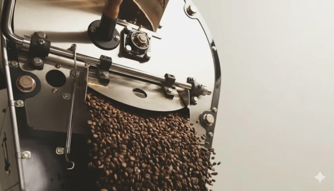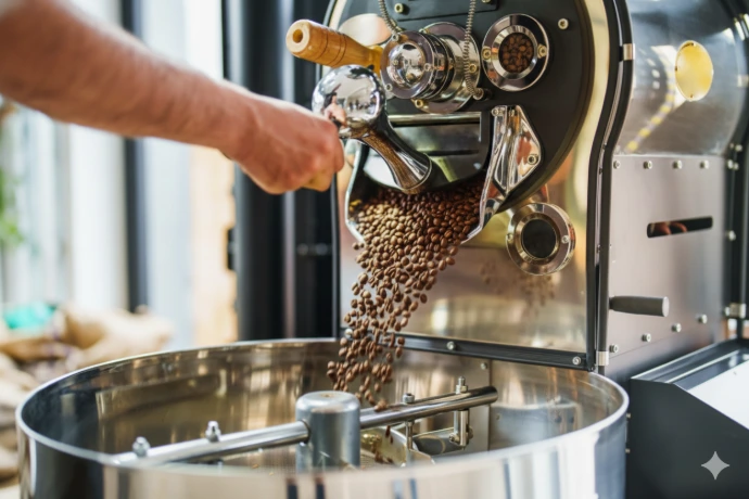 transforms hard, grassy green coffee seeds into aromatic, brown beans by applying dry heat, developing flavours through chemical reactions (like Maillard) and physical changes (drying, expansion) The process involves stages: drying (removing moisture), browning/caramelization (colour change, first crack), and development (releasing oils, darkening). Timing and temperature control are crucial for achieving different roast levels (light, medium, dark) and flavour profiles.